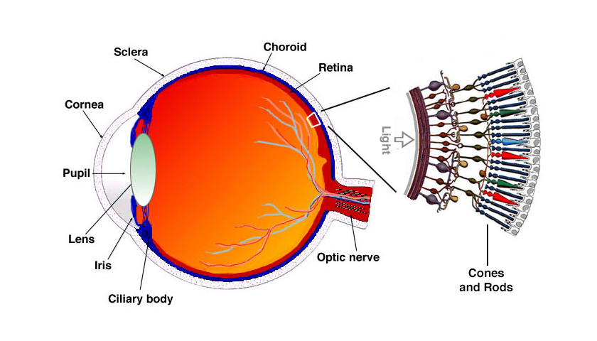 The first thing to take a look at would just be the basics of how vision for humans works. It may seem dry and boring at first, but after a little comprehension of what we know about this complex system it should start to make you scratch your head (at least it did for me). How do we get a constant three dimensional, vibrantly colorful, perception of the world around us?