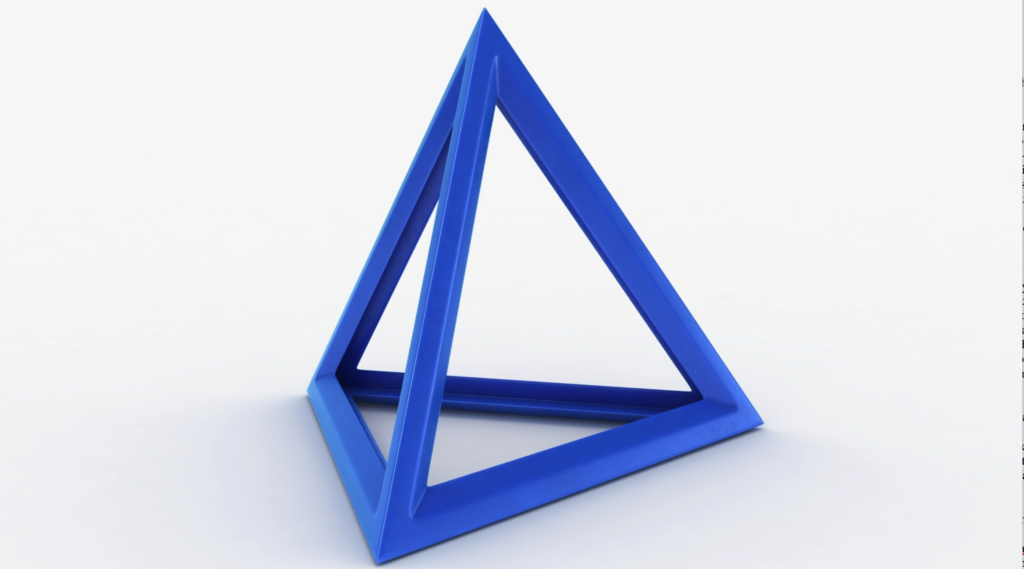 Speaking of Ying and Yang, it’s time to have some fun. I don’t usually want to needlessly jump into “woo-woo” on this show, so let’s say we are jumping into some “fun-fun.” While researching the tetrahedron, I was surprised to learn that Plato had also discussed it; it is considered one of the five ‘Platonic solids.’ He wrote about it in his work “Timaeus” almost 2,500 years ago. A Platonic solid is a shape in which all faces are identical regular polygons, the same number of faces meet at each vertex, and the shape is convex, meaning it has no indentations. There are only five of these shapes. The tetrahedron is unique in that it has the fewest faces, vertices, and edges. It is a shape studied for thousands of years for its mathematical beauty and symmetry. Interestingly, Plato associated it with fire.